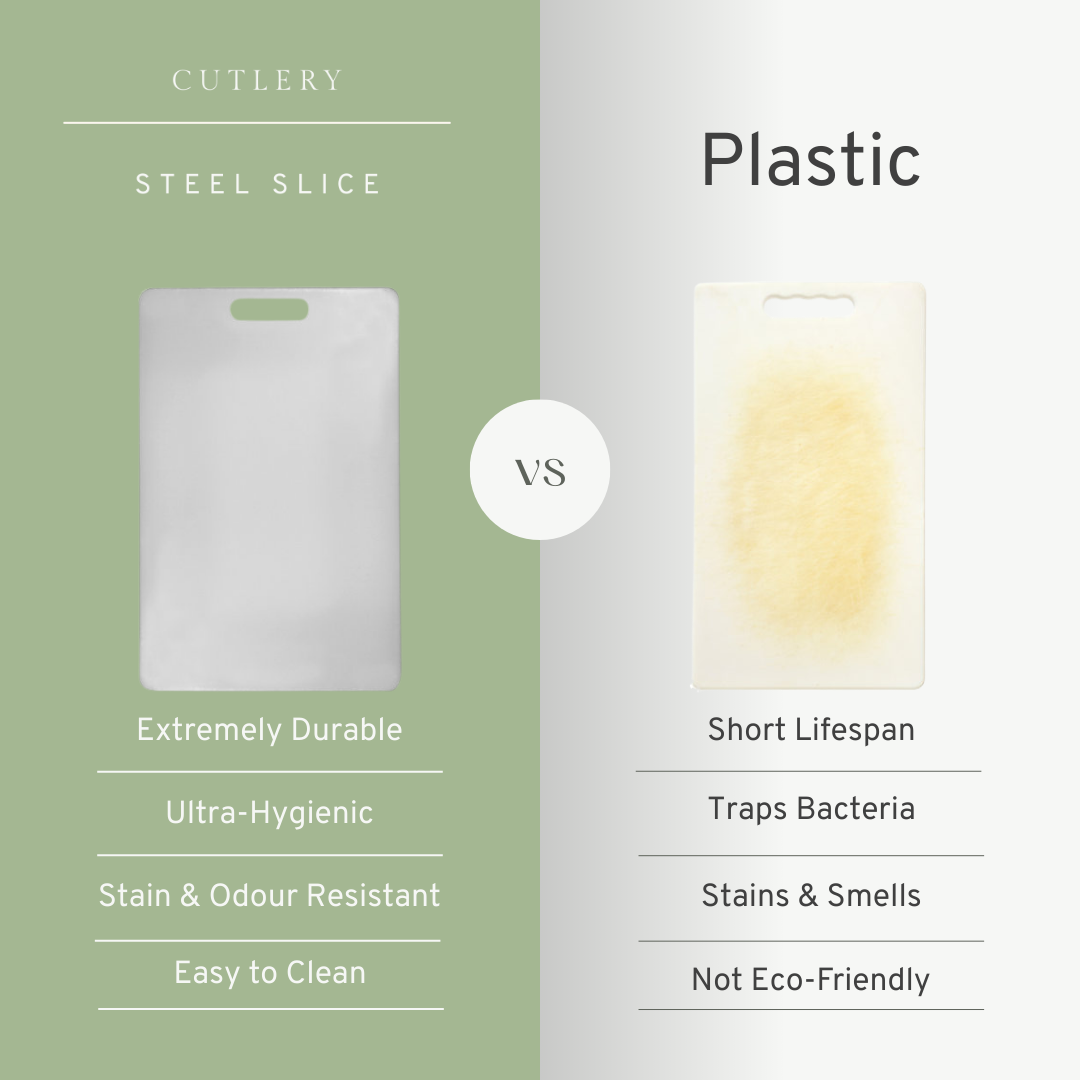 Our stainless steel chopping board is sturdy enough to stay in place while you cut, but still light enough to move, clean, and store with ease. Its slim design makes it practical for everyday use without taking up extra space.